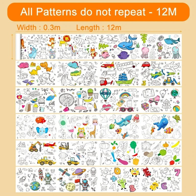 With multiple themes, this versatile drawing roll can be used on desks, floors, and furniture for endless fun (non-adhesive backing). It’s perfect for enhancing hand-eye coordination, creativity, and hands-on skills in kids, making it a great addition to school or home activities. Available in 300/600/1200cm lengths, this drawing roll encourages imagination and skill-building in a playful way—great for family time and interactive learning! Package includes: 1 Children’s Drawing Roll (non-adhesive, drawing pens not included).